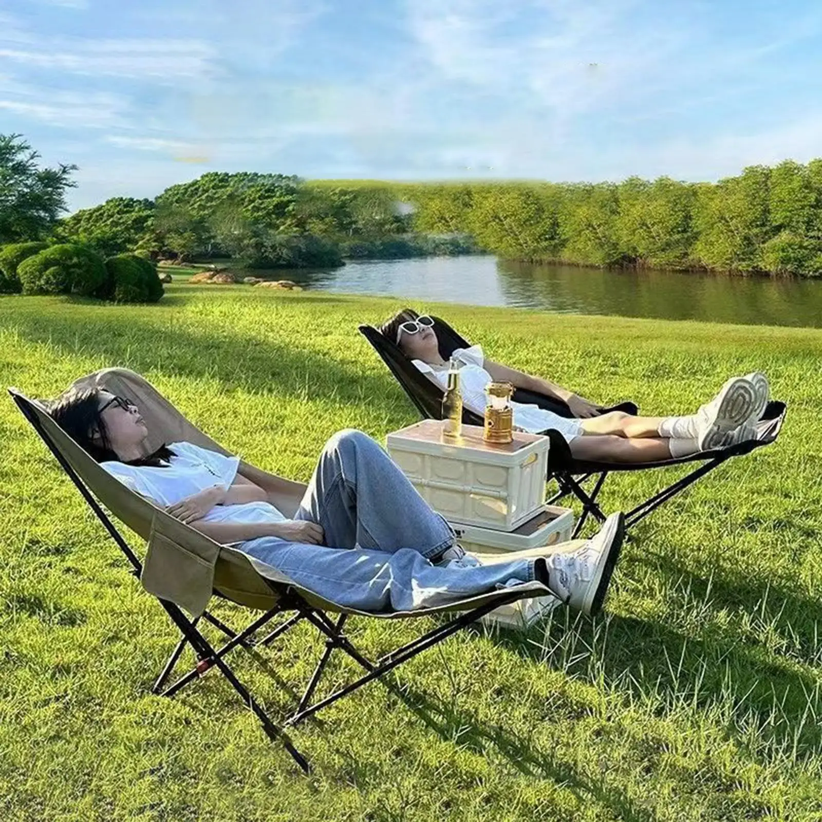 Outdoor Folding Lounge Chair with Foot Support Reclining Chaise Fishing Beach Chair Adjustable Angle for Garden Lawn Patio